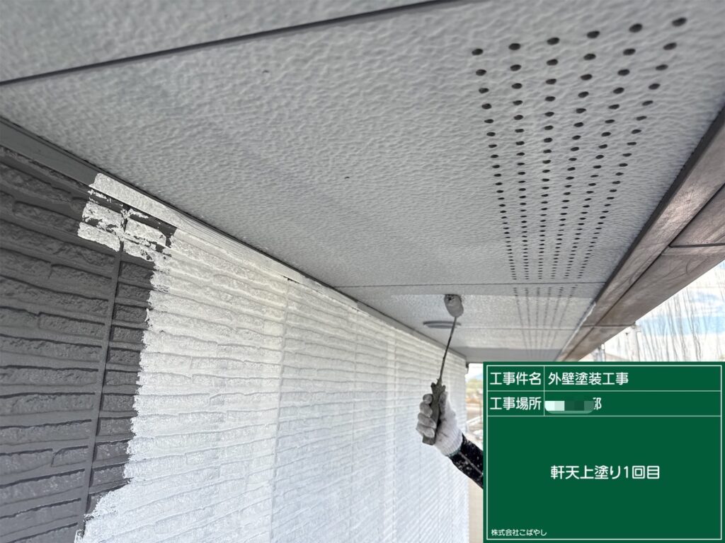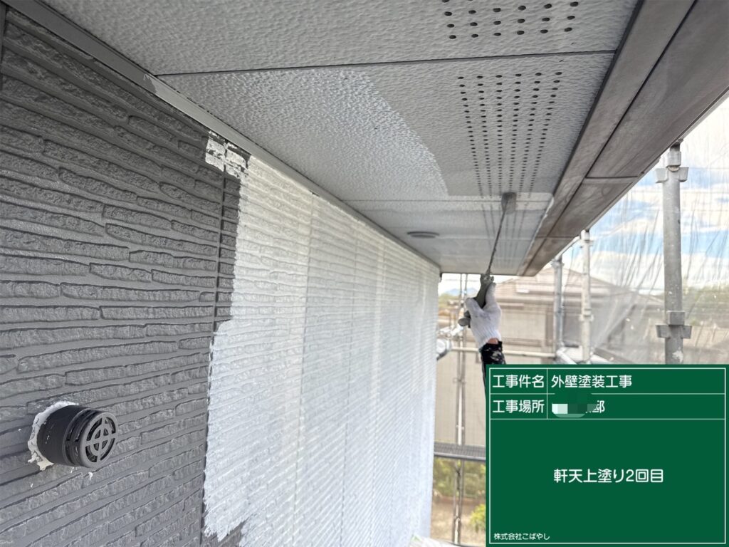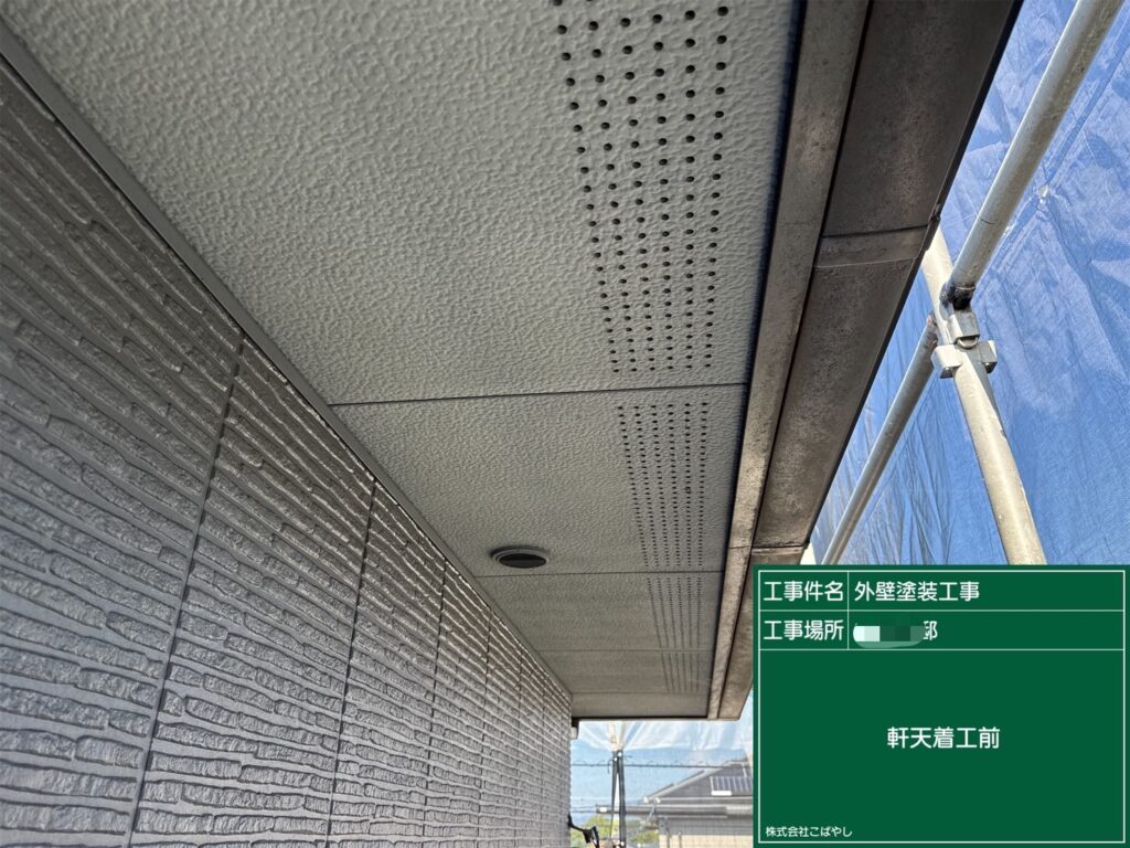 軒天のメンテナンスのサインは、塗膜の劣化や変色、シミです!放置すると塗膜の剥がれや欠落、穴ができたりもします!